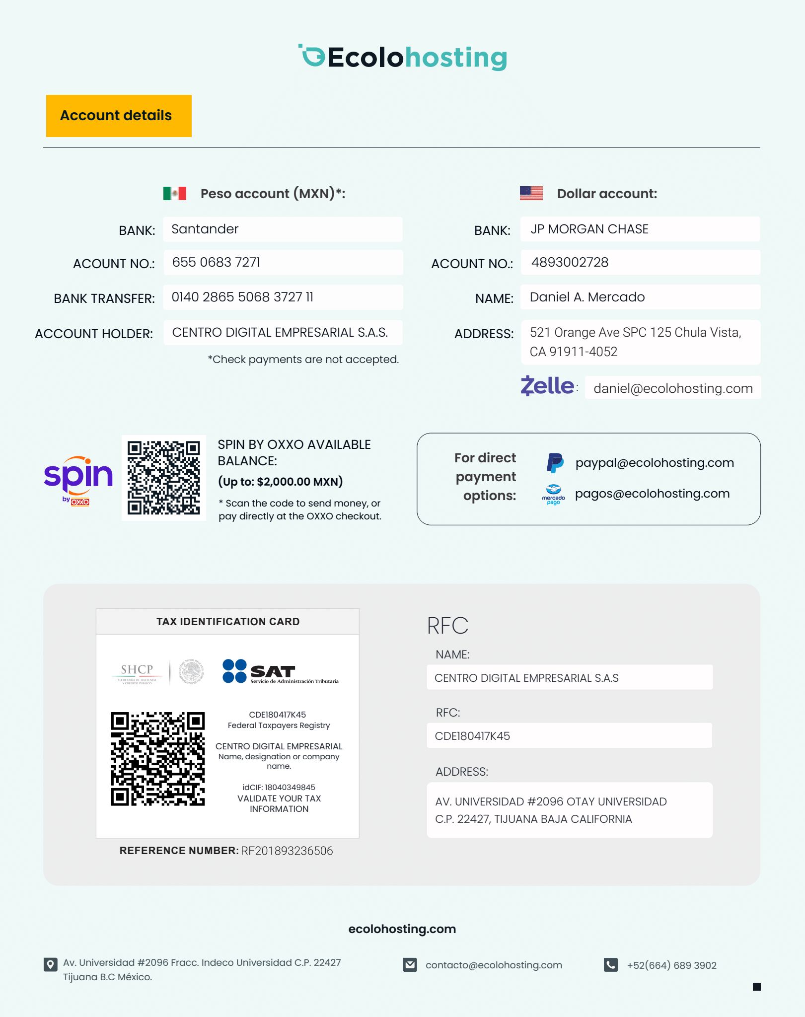 You can pay the services you hired in Ecolohosting in an easy, fast and secure way in any Oxxo...