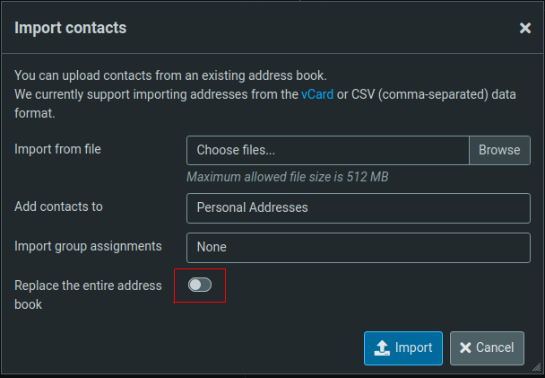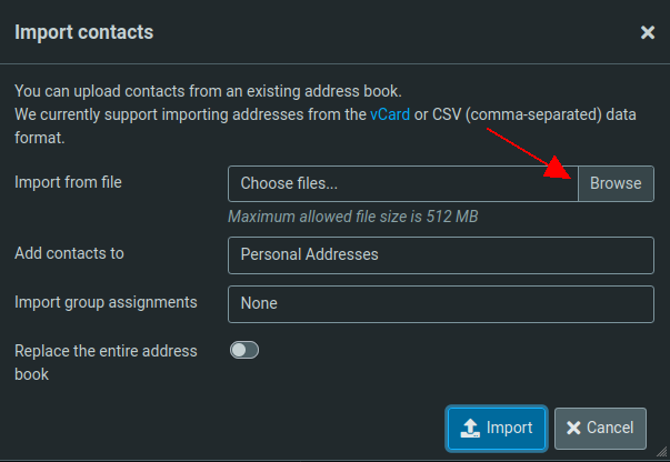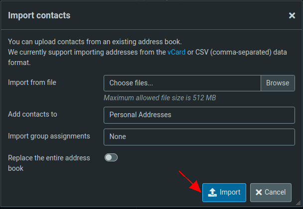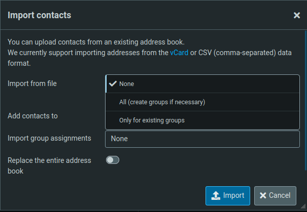 7. En "Import group assignments" elegir si se quieren importar los contactos con los grupos previamente creados: ninguno, todos (y crear nuevos si es necesario), sólo a los existentes.